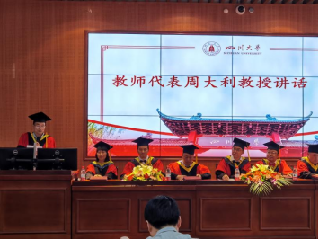 教师代表周大利教授发言,嘱咐毕业生们不忘母校恩情,谨记校训,努力工作,为社会贡献力量,同时要学会爱与责任,学会忘记、懂得坚持,拥有健康的身心。